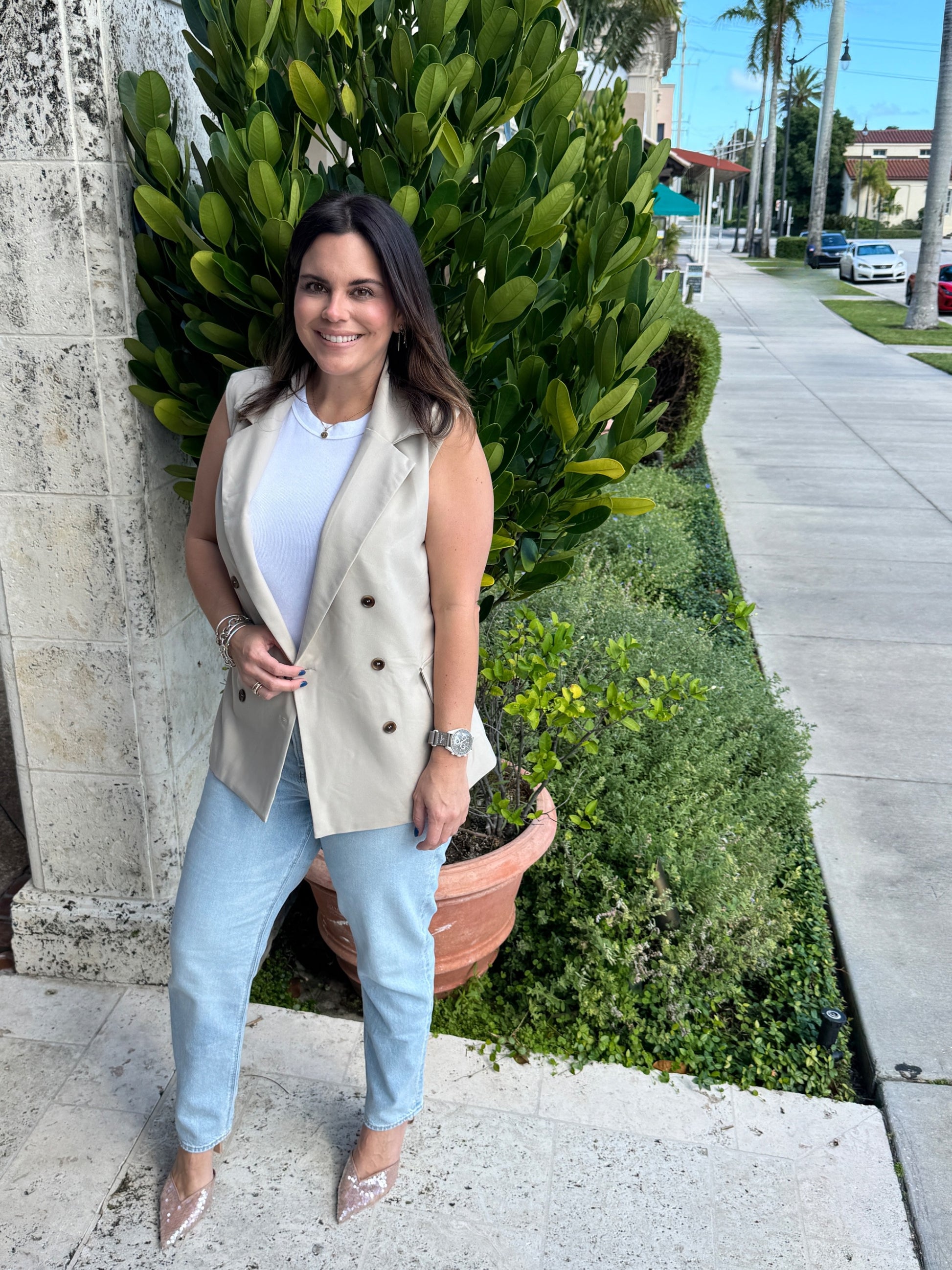 Elevate your style with this chic cream longline vest, a perfect layering piece for any season. With its double-breasted buttons and tailored fit, this vest brings a sophisticated touch to both casual and professional looks. Pair it with a basic tee and jeans for a polished yet effortless outfit.