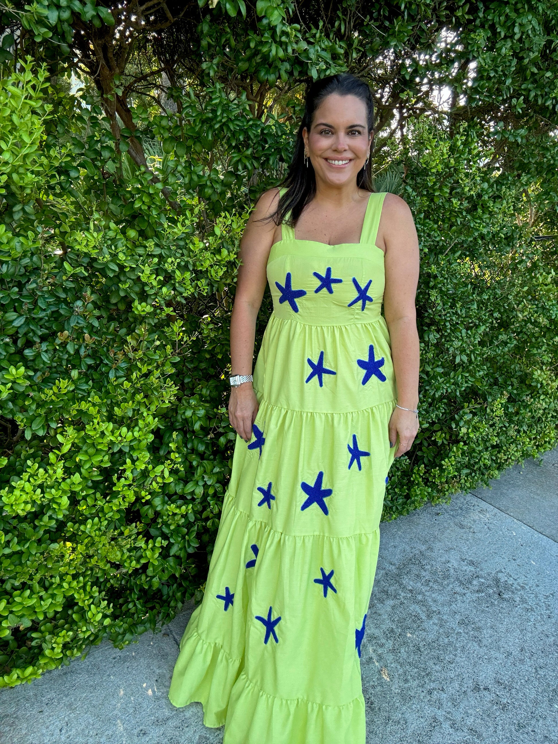 Step into summer with our Starfish Maxi Dress, a vibrant and playful addition to your wardrobe. This dress captures the essence of a sunny seaside escape, featuring a lively lime-green color adorned with bold blue starfish appliqués.